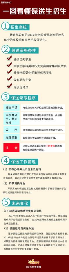 五、高校要将已测试合格拟录取的保送生数据库上传至教育部阳光高考信息平台(http://gaokao.chsi.com.cn/)。有关生源所在省级招办随后在网上审核确认后下载数据并办理录取手续,再将保送生录取名册寄至相关高校。经省级招办审核录取的保送生不再参加普通高校招生全国统一录取。 |